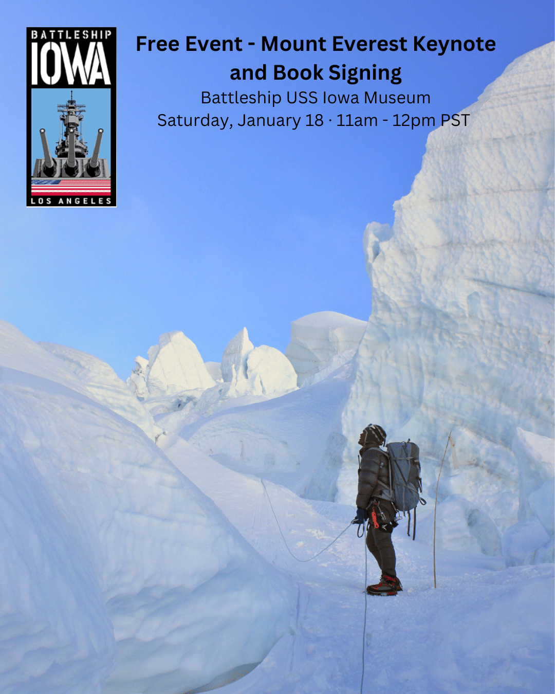 January 18, 11am - 12pm - Everest Talk/Book Signing aboard USS Iowa, San Pedro, CA
